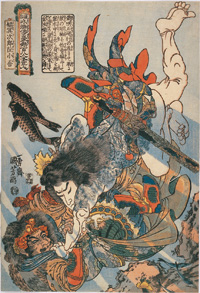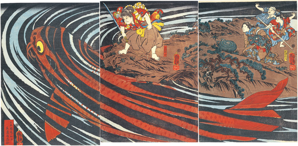 ![]() 鬼若丸の鯉退治 弘化2年(1845)頃 大判三枚続 (前期 7/9~7/31) 竜巻のごとき勢いで巨大な赤鯉が出現! 鬼若丸がこれを捕らえんとする緊張の瞬間! 大判三枚続の画面が繰り広げる、動と静のスペクタクル! |