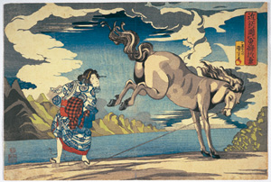 | 浮世絵の美人が、西洋風景画に飛び込んだ!?怪力女“近江のお兼”が手綱を下駄先で踏みつけて荒馬を鎮めてしまった。西洋の銅版画を下敷きにした意欲作。 |