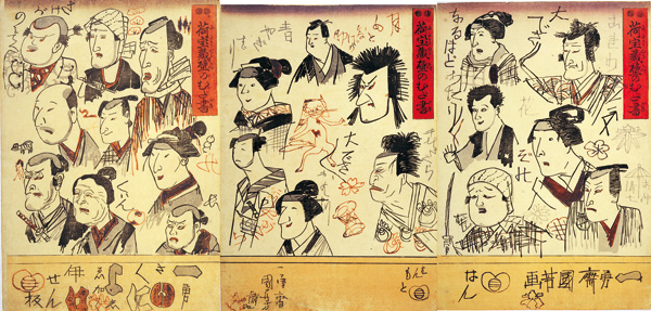 ![]() 「荷宝蔵壁のむだ書」黄腰壁 嘉永元年(1848)頃 大判三枚 (後期 8/2~8/21) 漆喰の白壁に金釘流の落書き!と思いきや、歌舞伎役者の似顔絵だ!にゃろめ! |