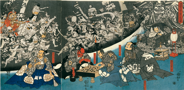 ![]() 「源頼光公館土蜘作妖怪図」 天保13-14年(1842-43) 大判三枚続 (後期 8/2~8/21) 土蜘蛛の妖術に苦しむ頼光は、 国家の危機にもかかわらず惰眠をむさぼる将軍徳川家慶を表す。 主君の危機を知らん顔する四天王、卜部季武は老中水野忠邦だという。 妖怪たちは天保の改革で取り締まられた人々の怨念で、 悪政に対する風刺が隠された作。 |