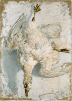 | セガンティーニの静物画の傑作の一つ。輪郭には「スフマート」というぼかしの技法が用いられ、また白い背景の前に白いガチョウを置くなど、様々なニュアンスの白の色調を用いて、羽毛の材質感を表現しています。 |