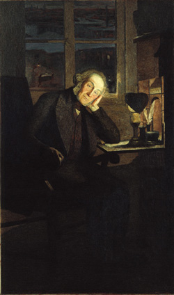 | ミラノのオスペダーレ・マッジョーレ(施療院)の創立者の肖像。 晩年のセガンティーニ唯一の注文による制作です。この作品は、純色を線状に分割して画面に並置していく、セガンティーニ独自の色彩分割技法が用いられています。窓の向こうには、セガンティーニが好んで冬に滞在した、ソーリオの夜景が広がっています。 |