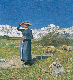 | アルプスの高原風景をセガンティーニ独自の色彩分割技法で描き、明るい画面に仕上げています。中央の女性のモデルは、セガンティーニ家の子守だったバーバ・ウーフェルで、彼女は多くのセガンティーニ作品に登場しています。 |