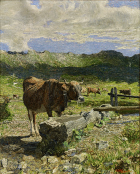 | セガンティーニの色彩分割技法を用いた作品の中でも、傑作の一つとされています。この技法を用いることにより光だけでなく、牛の毛の質感、牛の口から滴り落ちる水のきらめき、雨上がりに光り輝く草原の風景をも再現することが可能になったのです。 |