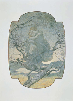 | ここにはセガンティーニが当時示し始めていた象徴主義の傾向をはっきりと見て取ることができます。木の幹に座る子どもを抱きかかえた母親は、この世のマリアとしてとらえられ、現世の存在の死や没落に対して勝利するものとして描かれています。 |