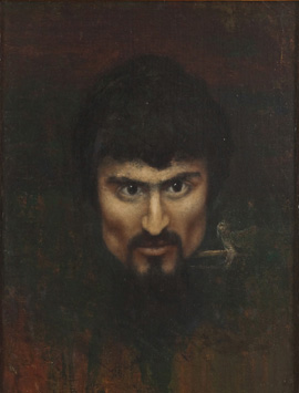 | セガンティーニ24歳の時の自画像。首の右側にはナイフや剣と思われるモティーフが描かれ、斬首を象徴しているようにみえます。このイメージは洗礼者ヨハネやゴリアテなどの聖書に登場する殉教者・犠牲者たちを彷彿とさせますが、セガンティーニは自らを彼らになぞらえていたと考えられています。 |