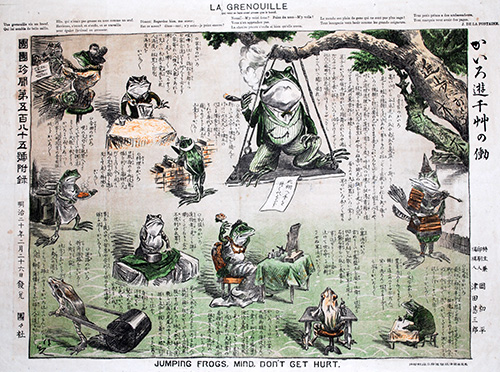 明治14(1881)年以後、清親は雑誌『団団珍聞(まるまるちんぶん)』をはじめ、ジャーナリズムとの関係を深めながら風刺画を多く手がけました。浮世絵師としての本領を発揮し、多様な題材を扱った戯画もまた、清親の一面です。