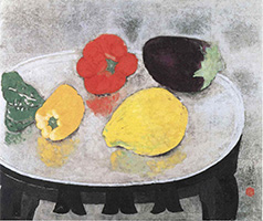 大正9年(1920)、遊亀は鎌倉の安田靫彦を訪ね、生涯師と仰ぐことになります。靫彦をはじめ、速水御舟、小林古径、小茂田青樹ら再興院展の先輩たちの薫陶を受け、遊亀は画家への道を歩み始めました。戦前には写実的で細密な作風でしたが、戦争を経て社会も美術も大きく変わる中、遊亀は大胆な単純化とデフォルメによるモダンな作風を確立しました。