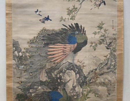 今にも尾羽を広げんと岩の上に立つ雄の孔雀と、その下で憩う雌の孔雀。海棠(かいどう)の枝には繁栄を表す綬帯鳥(じゅたいちょう)が止まり、周辺では小禽が飛び交っています。and more -