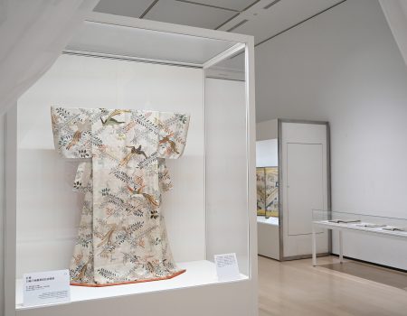 2025年11月18日「きもののヒミツ」展示紹介①《打掛 白綸子地藤菱尾長鳥模様》