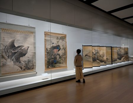 今にも尾羽を広げんと岩の上に立つ雄の孔雀と、その下で憩う雌の孔雀。海棠(かいどう)の枝には繁栄を表す綬帯鳥(じゅたいちょう)が止まり、周辺では小禽が飛び交っています。作者は岸派の創始者で江戸時代後期に活躍した絵師の岸駒(がんく)(1749/1756-1838)で、沈南蘋(しんなんぴん)や西洋画を学び独自の画風を確立、特に虎の絵を得意としました。本作も鮮やかな色彩や写実的な孔雀の表現に沈南蘋の影響がみられます。