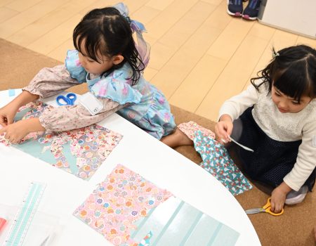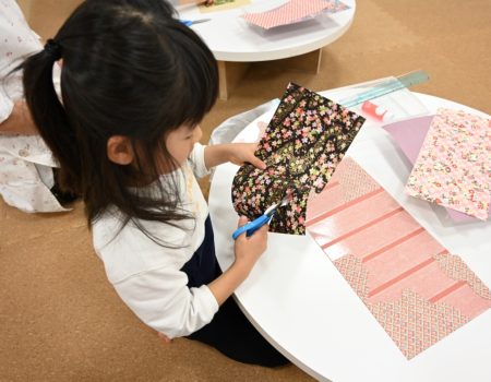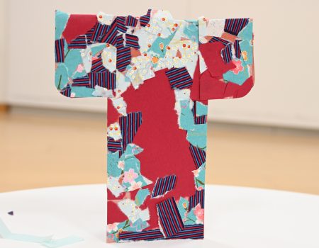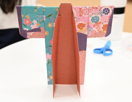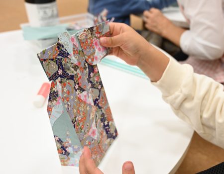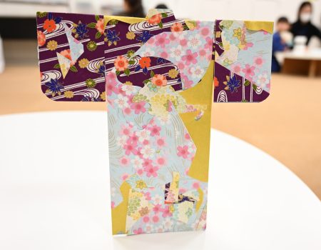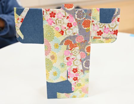 一枚の紙に華やかな柄の友禅和紙を自由に組み合わせて貼り、それらを立体の着物の形に組み立て、自分だけのミニ着物を制作しました。
