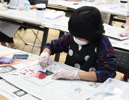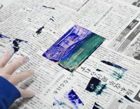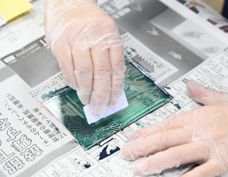 インクをヘラで伸ばした後、余分なインクを新聞紙で拭き取ります。