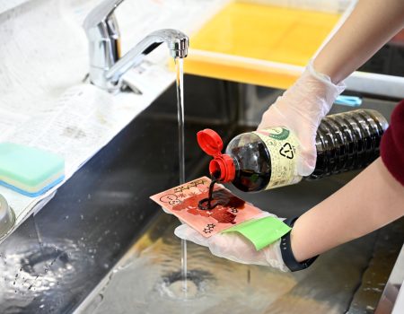 腐蝕後、水洗いした銅板に醤油をかけて腐蝕液を中和し、腐蝕の進行を止めます。