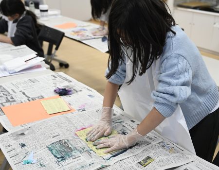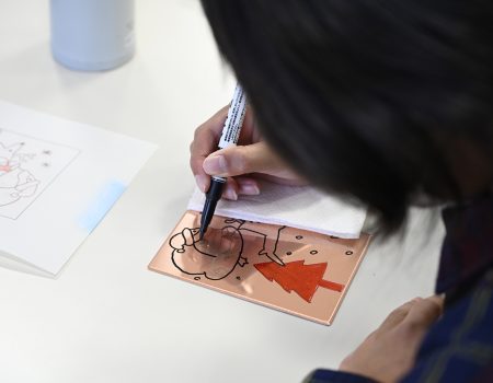今回はクリスマスにあわせ、銅版画家の武田あずみさんを講師に招き、昨年度同様、エッチング*の技法を用いてクリスマスカードを制作しました。