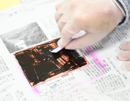 銅板への描写が終わったら、腐蝕液に15 分ほど浸します。