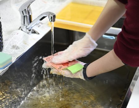 インクをヘラで伸ばした後、余分なインクを新聞紙で拭き取ります。