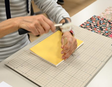 表紙用の和紙を折り、でんぷんのりで見返しと貼り合わせます。