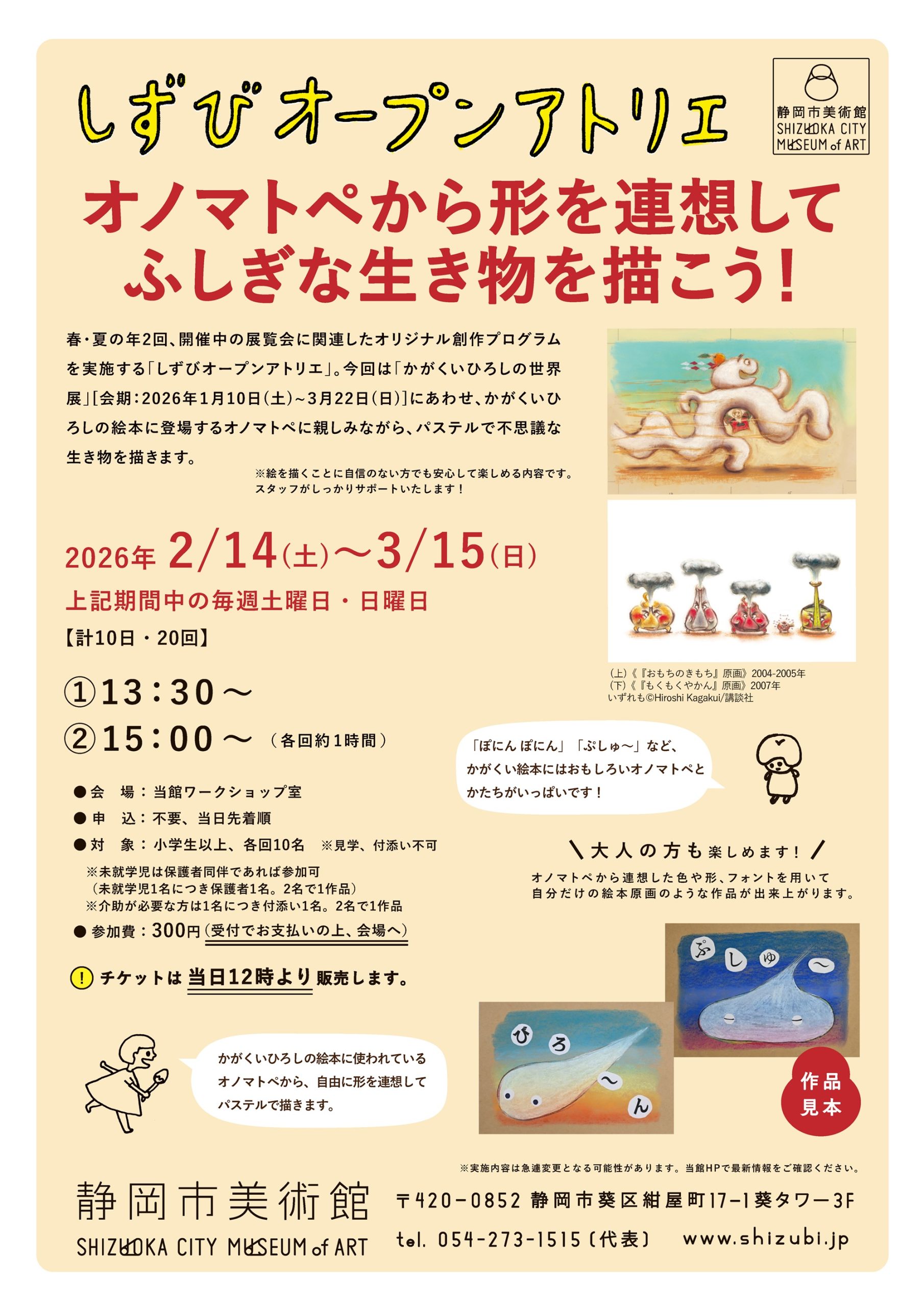 春・夏の年2回、展覧会に関連したオリジナル創作プログラムを実施する「しずびオープンアトリエ」。今回は、「かがくいひろしの世界展」(会期:2026年1月10日(土)~3月22日(日))に合わせ、かがくいひろしの絵本に登場するオノマトペに親しみながら、パステルで不思議な生き物を描きます。