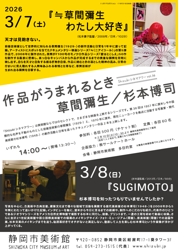 「Shizubiシネマアワー」は美術館ならではのセレクトで、さまざまな映画を上映するシリーズです。第36回は1957年に渡米し今や国際的な名声を不動のものとした前衛芸術家の草間彌生(1929-)と、1970年に渡米、現在ニューヨークを拠点に活動する写真家・現代美術家の杉本博司(1948-)の創作活動と日常を追ったドキュメンタリー作品2本を上映します。
