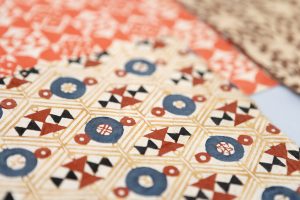萠木会は、芹沢銈介門下の染色家の団体です。戦後まもなく、材料の入手や、個人では難しい販売の交渉などを共同で行う相互扶助的な団体として出発し、1946年に東京・日本橋の三越で第1回展を開催しました。研究会としての側面もあり、芹沢の指導のもと、創作と商業性の両立をめざし、会員それぞれの個性に従って創作に励んだといいます。1957年には東京都に染色共同組合として登録し、都内にショールーム兼事務所を構えました。芹沢の後を受け、組合の二代目理事長には柚木沙弥郎が就任、1980年代には静岡市在住の染色家、大橋豊久が理事長に就任し、1998年12月に解散しました。