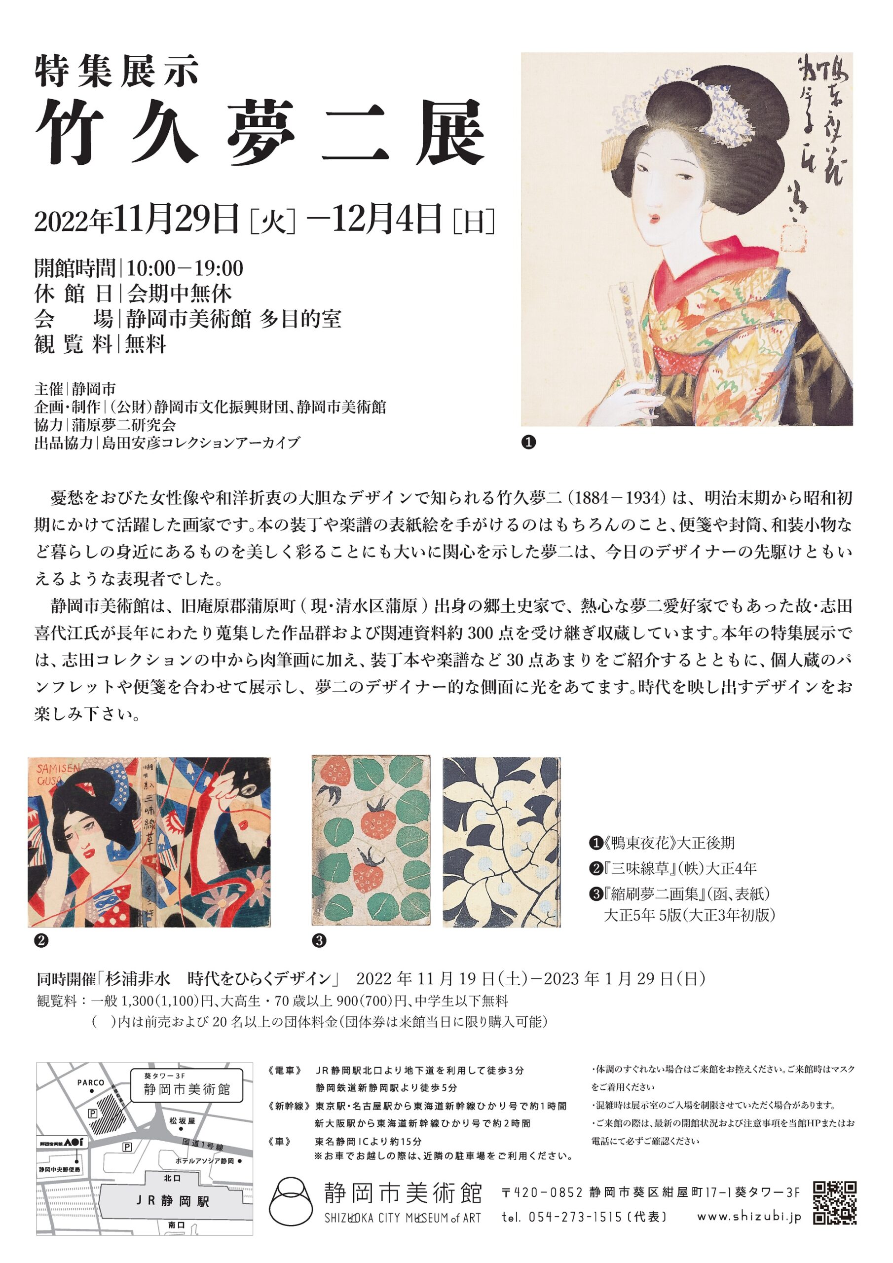 当館が所蔵する竹久夢二作品の中から、肉筆画のほか装丁本や楽譜といった夢二デザインの印刷物を展示します。