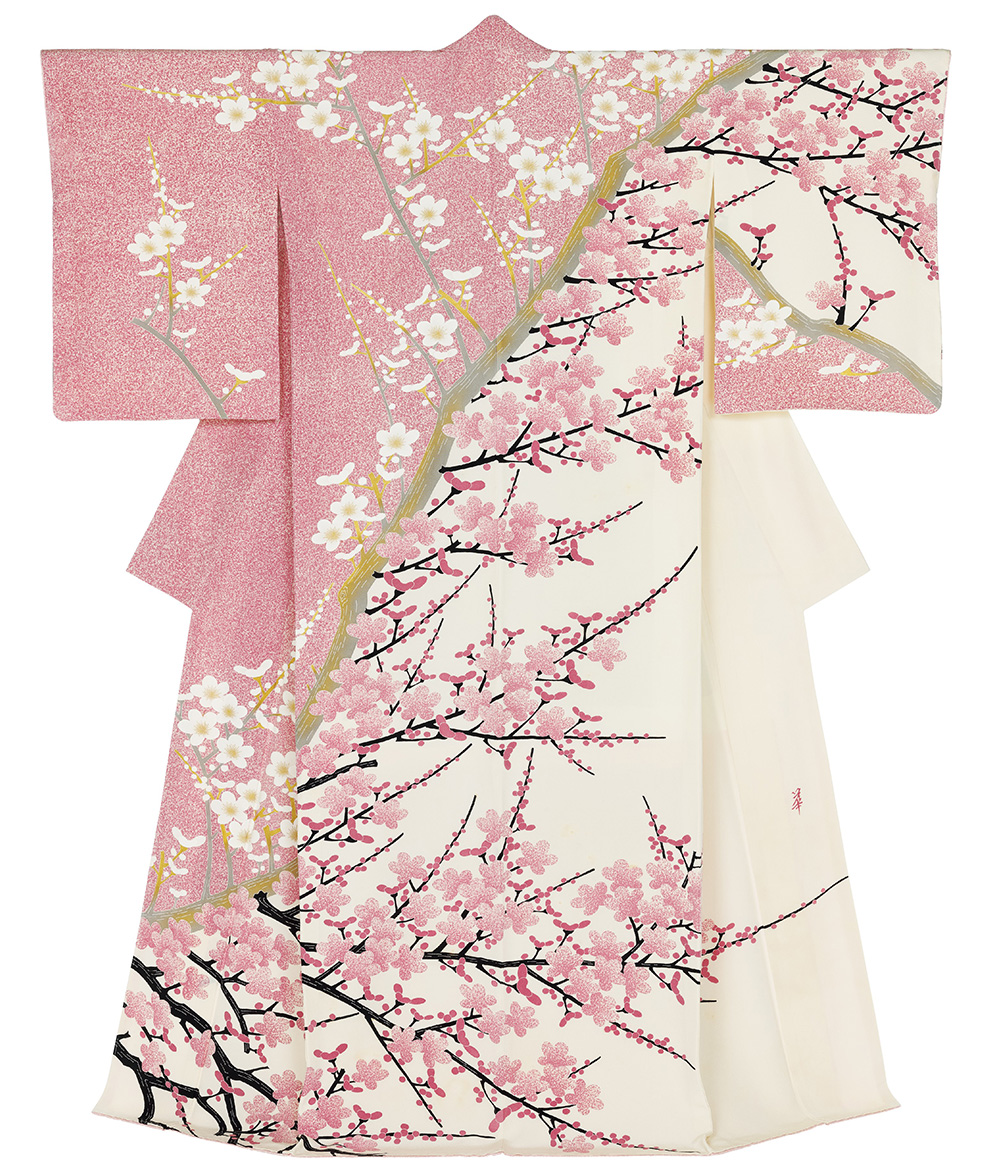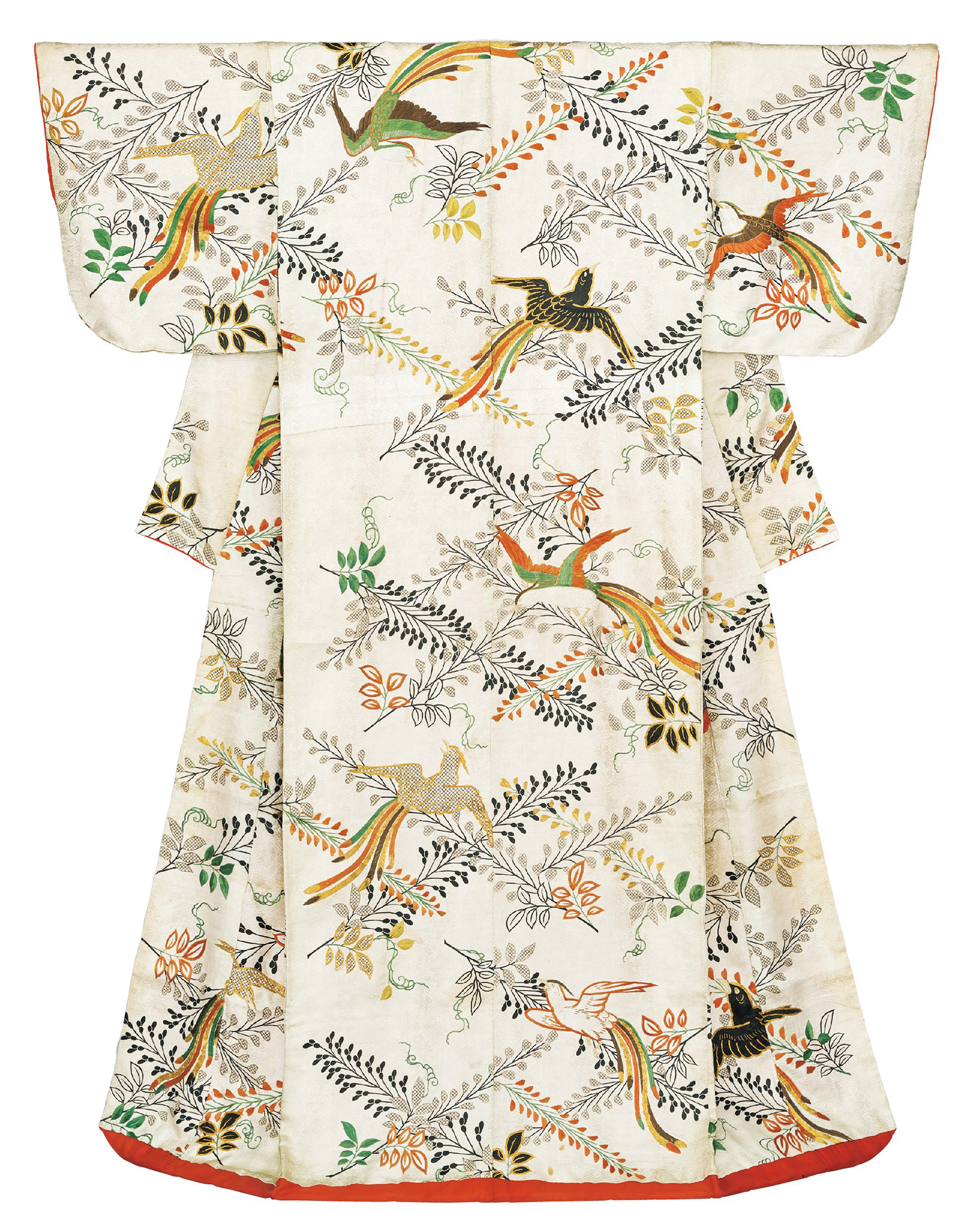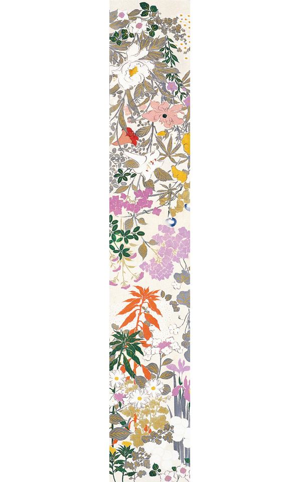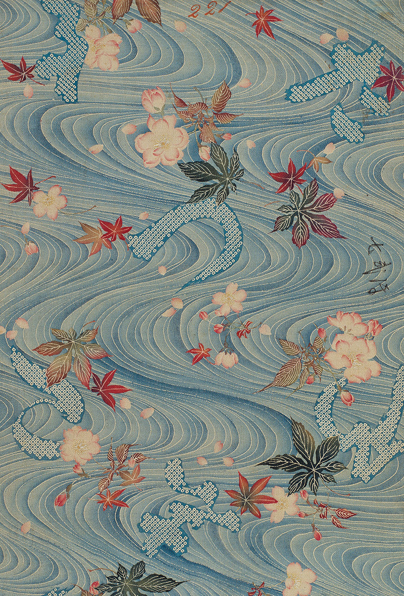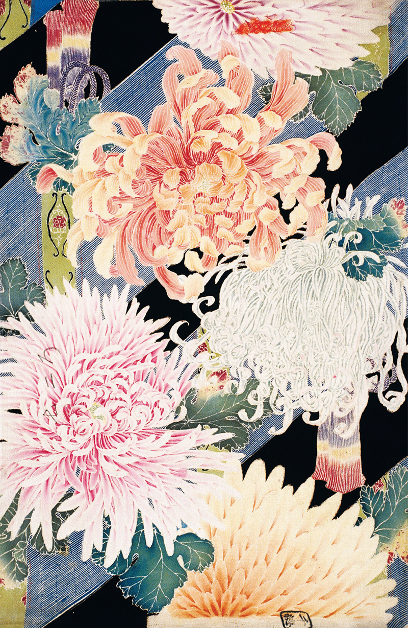 幕末頃になると形式化していたきものの意匠は、近代に入り京都画壇の画家たちが下絵を担うようになることで刷新されていきました。