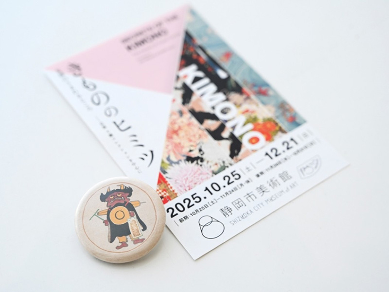11/15の「きものの日」にちなみ、11/11(火)~11/16(日)の15時以降に本展をご覧の方、各日先着50名様に静岡市美術館限定、「きもののヒミツ」展出品作品をモチーフにしたオリジナル缶バッジ(非売品)をプレゼント!