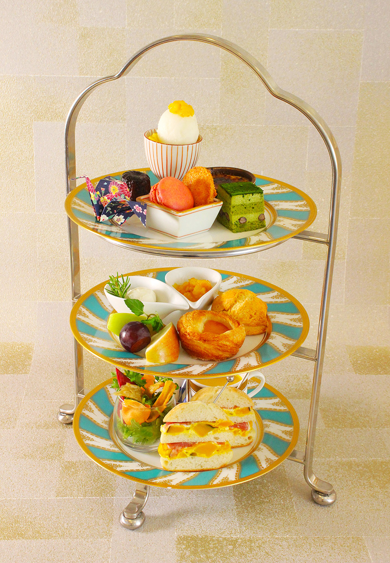 京都の「友禅染」を想起させる優美な器に、秋から初冬の旬の味覚を織り交ぜたアフタヌーンティーをご用意しました。アクセントに添えられた鶴のモチーフが、雅なひとときを演出いたします。