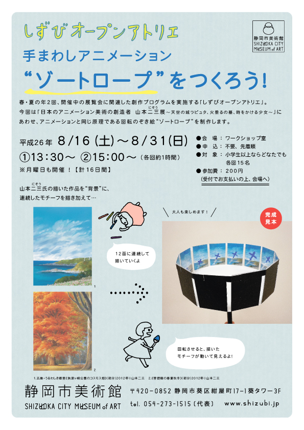 今回は「日本のアニメーション美術の創造者 山本二三展~天空の城ラピュタ、火垂るの墓、時をかける少女~」にあわせ、アニメーションと同じ原理である回転のぞき絵"ゾートロープ"を制作します。